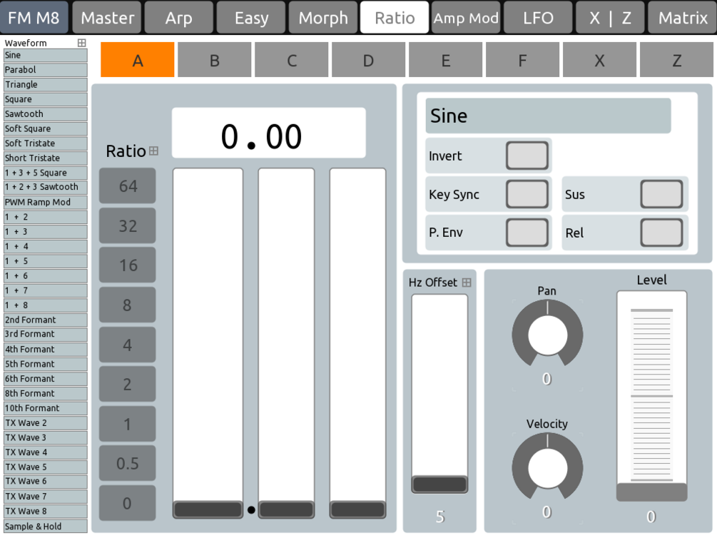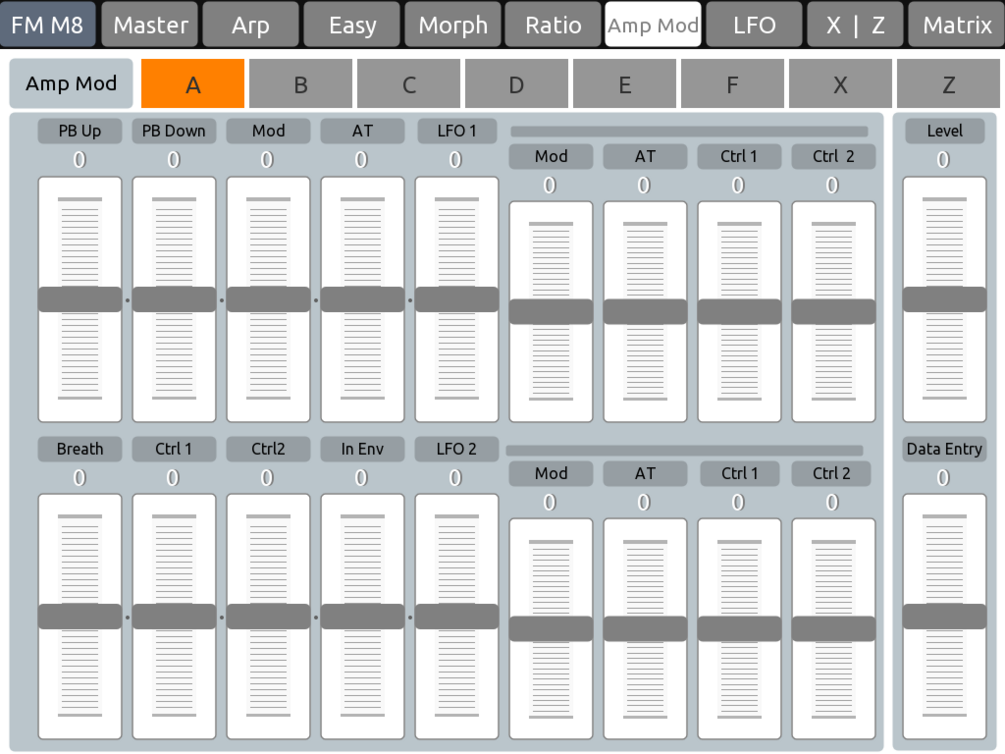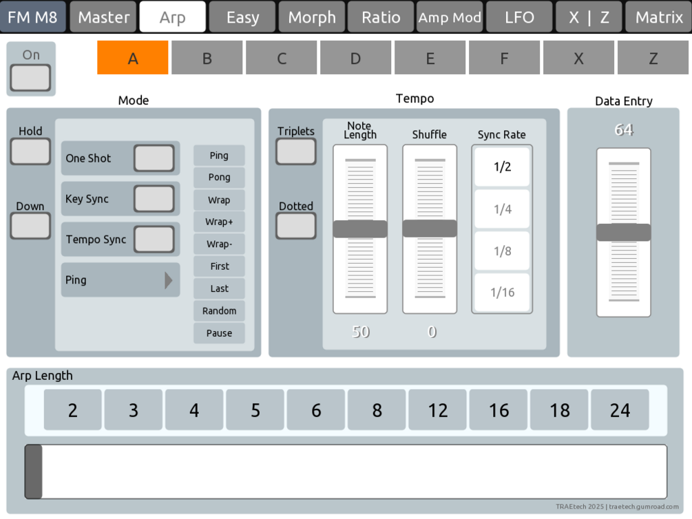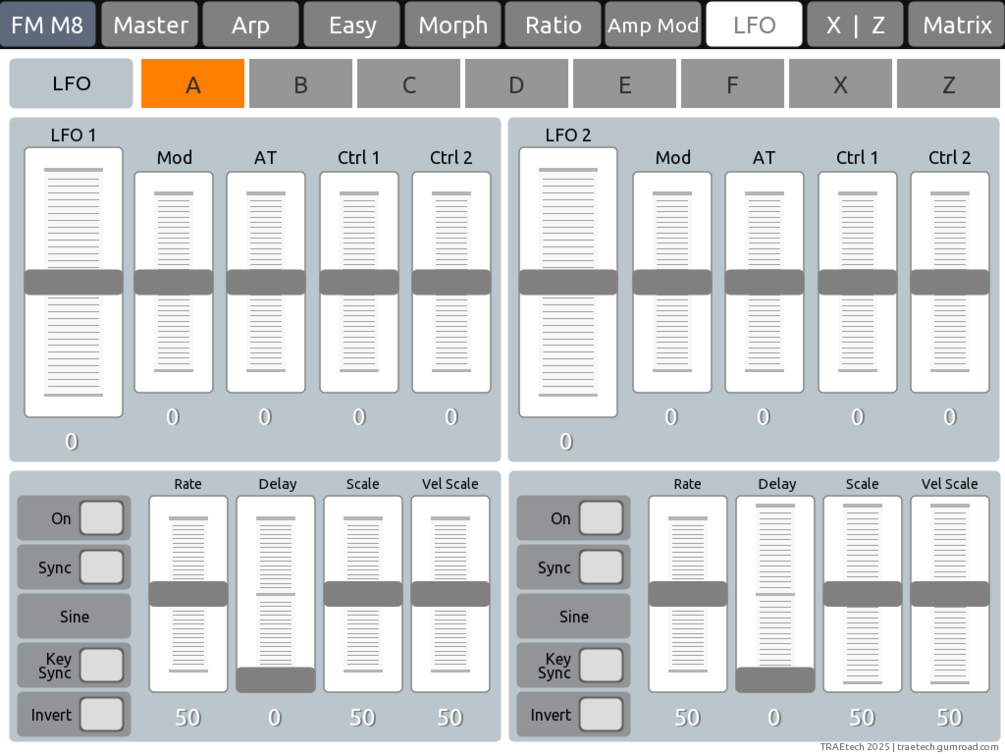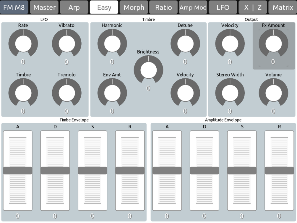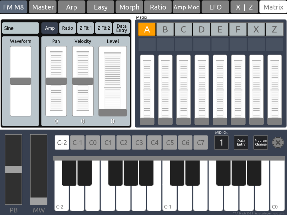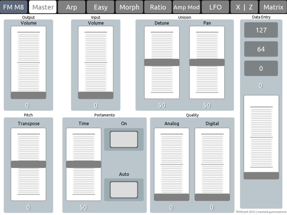 This is a custom TouchOSC layout built specifically for Native Instruments FM8, designed to streamline sound design by putting essential controls at your fingertips. The layout spans nine pages, each dedicated to a key section of FM8: from Operator selection and Ratio tuning to the Arpeggiator, Morph controls, and more. A Master page provides global access, while others like Easy and FX give you quick, centralized control of deeper parameters.
